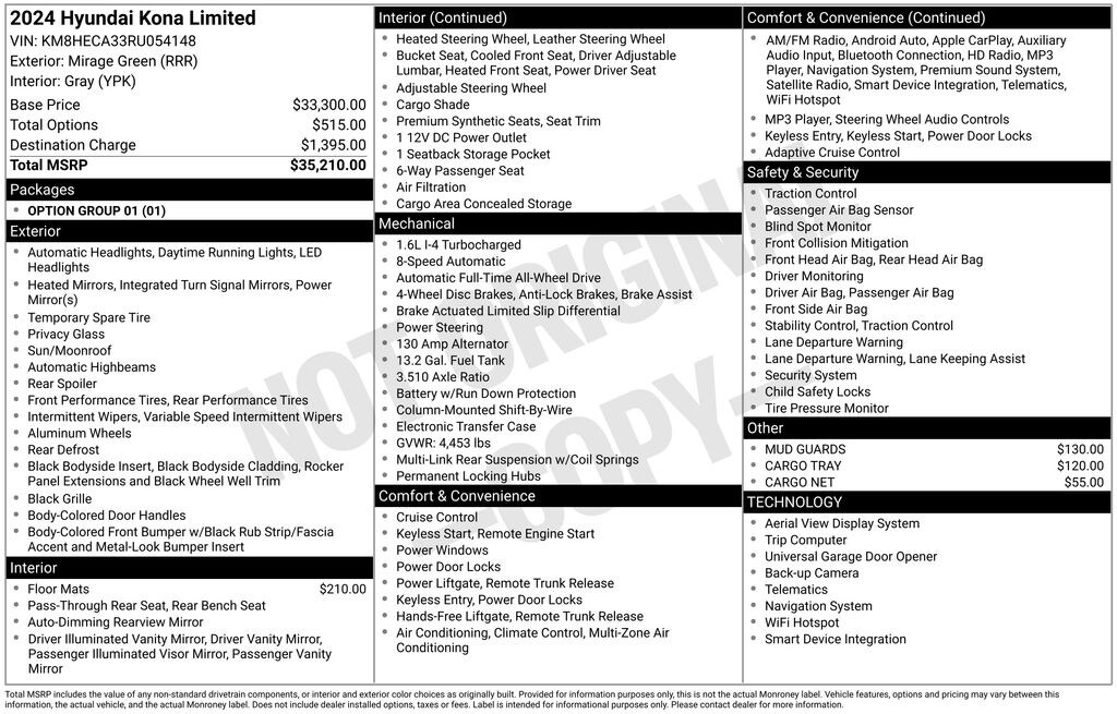 Option Group 01, 3.510 Axle Ratio, 4-Wheel Disc Brakes, 8 Speakers, ABS brakes, Air Conditioning, Alloy wheels, AM/FM radio: SiriusXM, Apple CarPlay & Android Auto, Auto High-beam Headlights, Auto-dimming Rear-View mirror, Automatic temperature control, Brake assist, Bumpers: body-color, Cargo Net, Cargo Tray, Carpeted Floor Mats, Column-Mounted Shift-By-Wire, Delay-off headlights, Driver door bin, Driver vanity mirror, Dual front impact airbags, Dual front side impact airbags, Electronic Stability Control, Emergency communication system: Bluelink+, Four wheel independent suspension, Front anti-roll bar, Front Bucket Seats, Front Center Armrest, Front dual zone A/C, Front reading lights, Fully automatic headlights, Garage door transmitter: HomeLink, H-Tex Leatherette Seat Trim, Heated & Ventilated Front Bucket Seats, Heated door mirrors, Heated front seats, Heated steering wheel, Illuminated entry, Leather Shift Knob, Leather steering wheel, Low tire pressure warning, Mud Guards, Navigation System, Occupant sensing airbag, Outside temperature display, Overhead airbag, Panic alarm, Passenger door bin, Passenger vanity mirror, Power door mirrors, Power driver seat, Power Liftgate, Power moonroof, Power steering, Power windows, Radio: AM/FM/HD Radio/SiriusXM Audio System, Rear anti-roll bar, Rear seat center armrest, Rear window defroster, Rear window wiper, Remote keyless entry, Security system, Speed control, Speed-sensing steering, Split folding rear seat, Spoiler, Steering wheel mounted audio controls, Tachometer, Telescoping steering wheel, Tilt steering wheel, Traction control, Trip computer, Turn signal indicator mirrors, Variably intermittent wipers, Ventilated front seats, and Wheels: 19" x 7.5J Glossy Black Alloy.