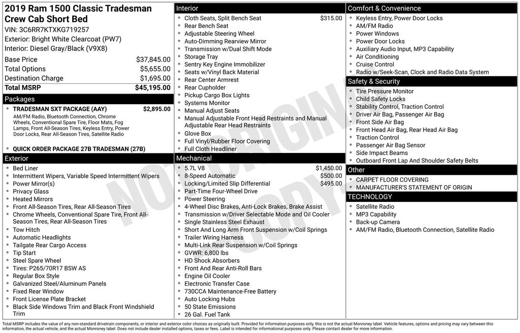 - Tradesman SXT Package w/Low Volume Paints$2,895