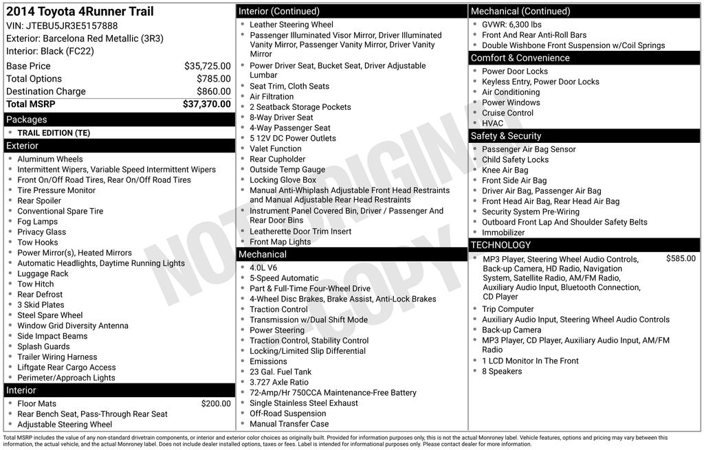 4WD, 17" x 7.5" Unique Off-Road Alloy Wheels, ABS brakes, Alloy wheels, Compass, Electronic Stability Control, Heated door mirrors, Illuminated entry, Low tire pressure warning, Remote keyless entry, Traction control, 3.727 Axle Ratio, 4-Wheel Disc Brakes, 8 Speakers, Air Conditioning, AM/FM radio, Anti-whiplash front head restraints, Black Roof Rails, Brake assist, Bumpers: body-color, CD player, Driver door bin, Driver vanity mirror, Dual front impact airbags, Dual front side impact airbags, Exterior Parking Camera Rear, Fabric Seat Trim, Front anti-roll bar, Front Bucket Seats, Front Center Armrest, Front fog lights, Front reading lights, Front wheel independent suspension, Knee airbag, Leather Shift Knob, Occupant sensing airbag, Outside temperature display, Overhead airbag, Overhead console, Panic alarm, Passenger door bin, Passenger vanity mirror, Power door mirrors, Power driver seat, Power steering, Power windows, Radio: Entune Audio Plus, Rear anti-roll bar, Rear seat center armrest, Rear window defroster, Rear window wiper, Roof rack, Speed control, Speed-sensing steering, Split folding rear seat, Spoiler, Steering wheel mounted audio controls, Tachometer, Telescoping steering wheel, Tilt steering wheel, Trip computer, Variably intermittent wipers, and Voltmeter.